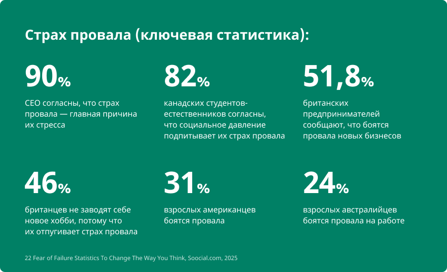 (1) Страх провала, страх успеха, страх выступать публично, страх быть отвергнутым, страх принять неверное решение, страх перед чужим мнением, страх ответственности, страх сказать что-то не то, страх, что в тебе разоблачат самозванца, страх принять на себя обязательства, страх перед сложными задачами, страх упустить что-то из виду (Common Fears That Keep Us Stuck, Psychology Today, 2019)