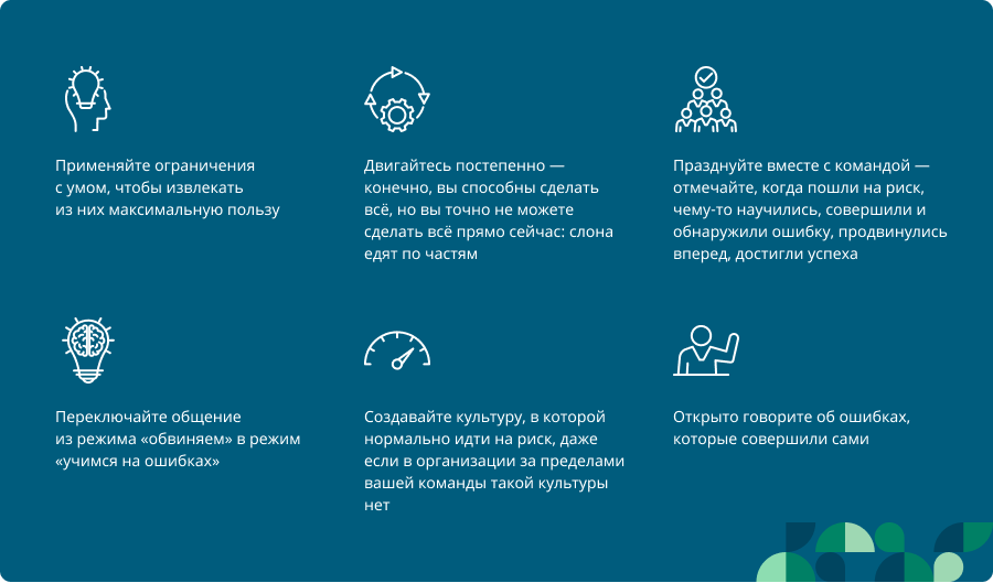 (4) Исследование связи командной работы с врачебными ошибками показало, что у самой эффективной команды выявлялось в 10 раз больше ошибок на 1 000 пациентов, чем у средней по эффективности. Причина была в том, что в менее эффективной команде люди опасались сообщать об ошибках, а значит и не учились на них и не улучшали свою работу. (Э. Эдмондсон, «Бесстрашная организация»)